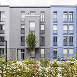 Wohnquartier am Rande des Frankenberger Viertels in Aachen mit 247 Wohnungen und einer Tiefgarage. Barrierefreier Wohnraum, differenzierte Fassadengestaltung in Anlehnung an die klassischen 3-4 Fensterhäuser der Jahrhundertwende. Hochwertiger Standard der Innenausstattung, lichte Raumhöhen in den Wohnungen von 2,70 m – 3,20 m.